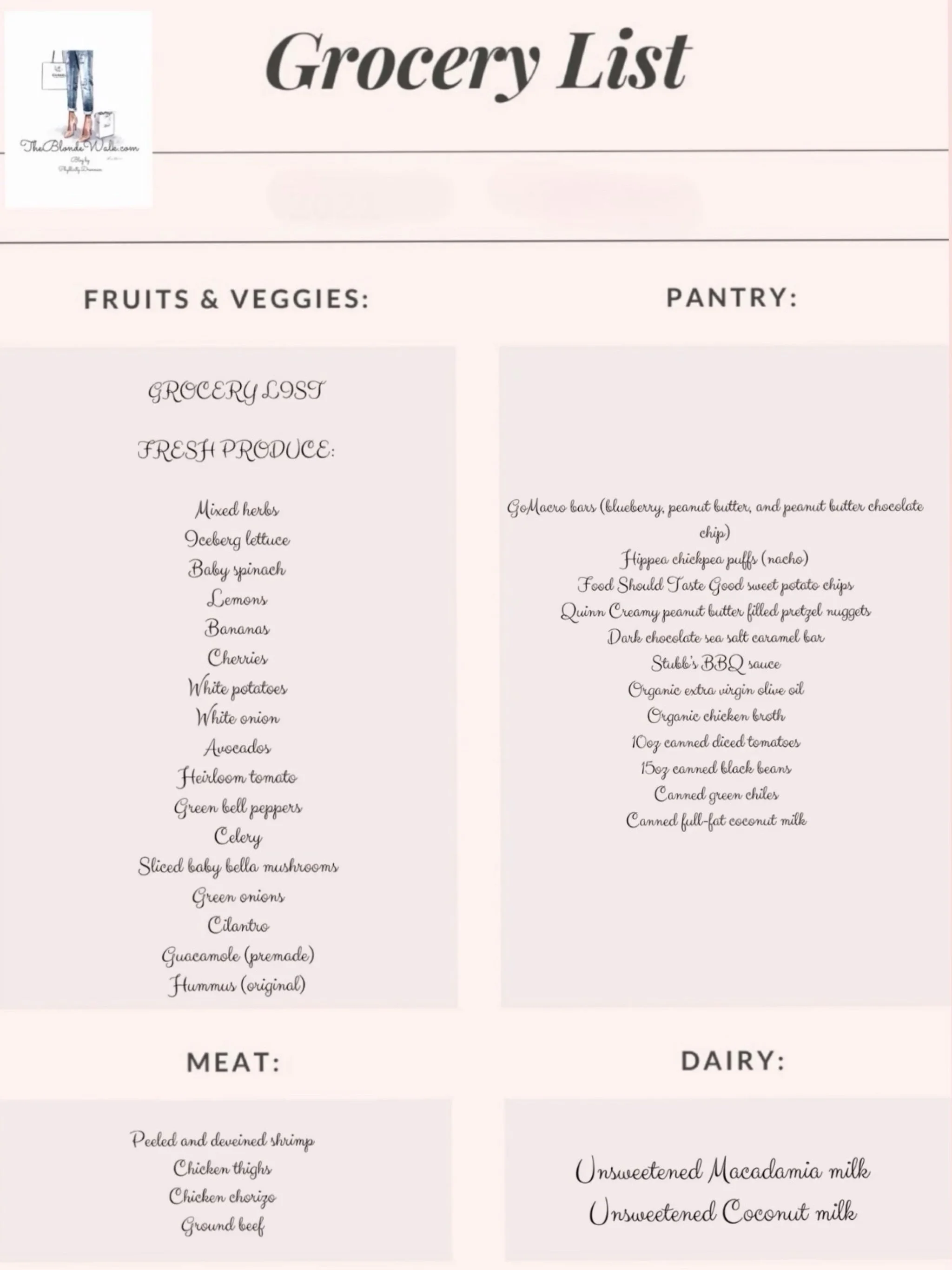 Below, I’m sharing my weekly grocery list along with an example of what I’m eating Monday through Sunday for breakfast, lunch, dinner, snacks, and dinner.