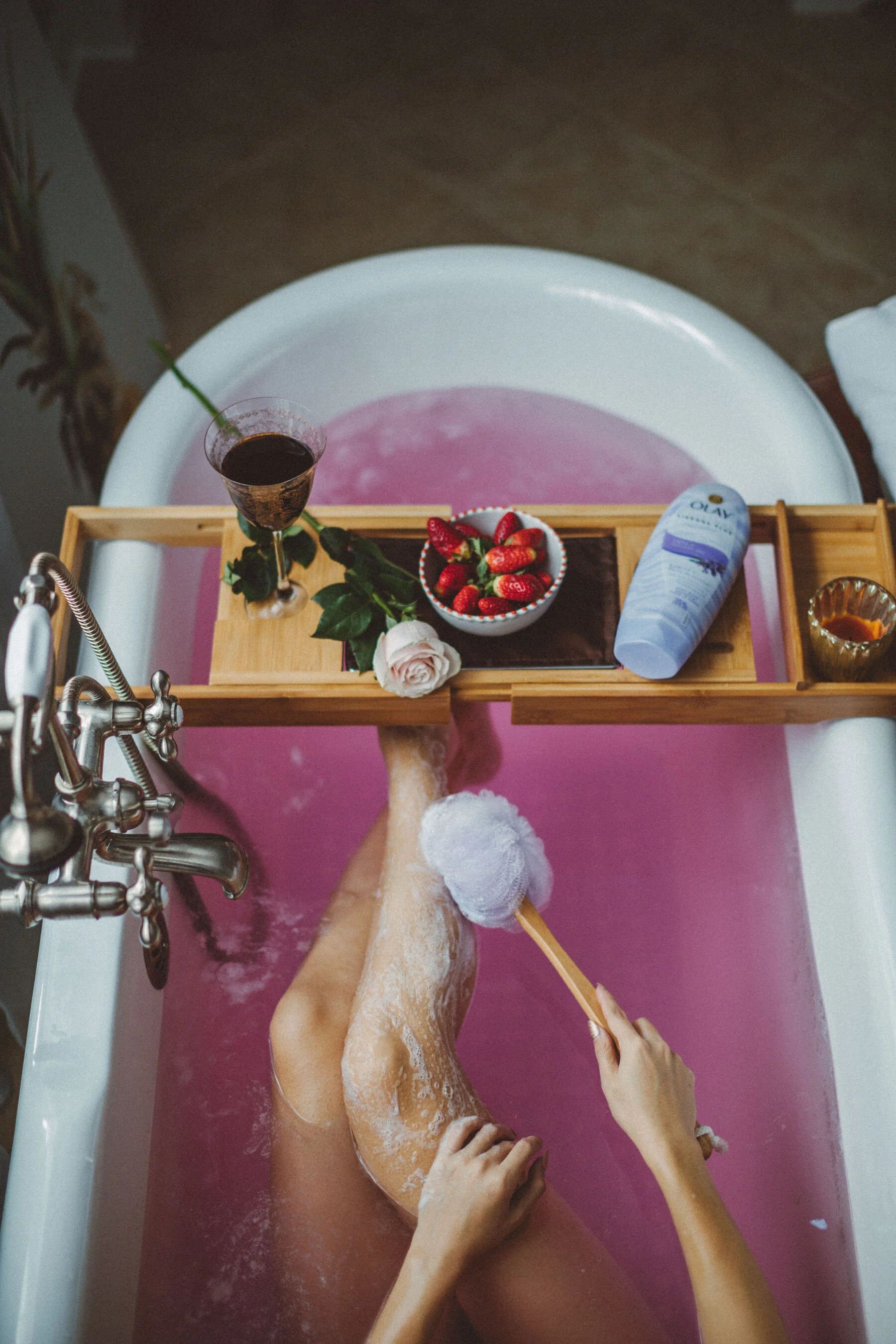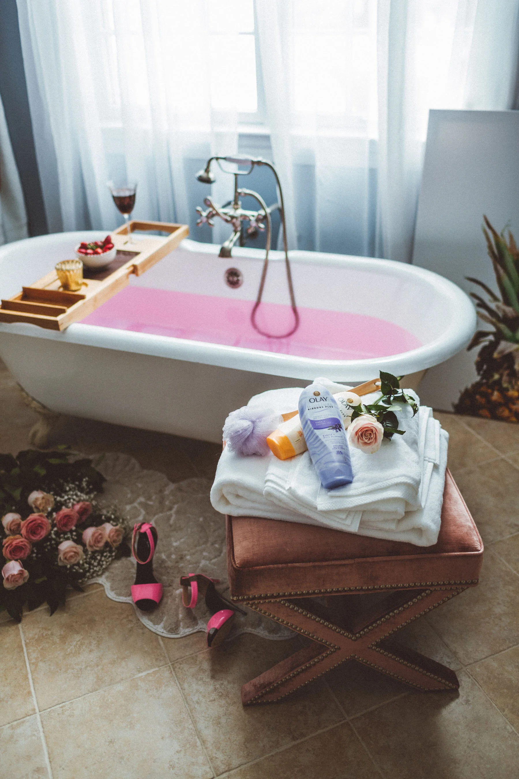 3. Next, leave on your hair mask and put on a shower cap, then rinse out the shower and prep for a nice tub soak. While the tub is filling, wash your face, then use a facial scrub, then apply a face mask.